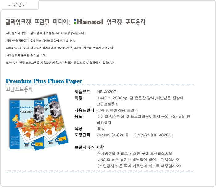 ▶ 품명 : 한솔 고급 고광택 포토용지 HB-4020G