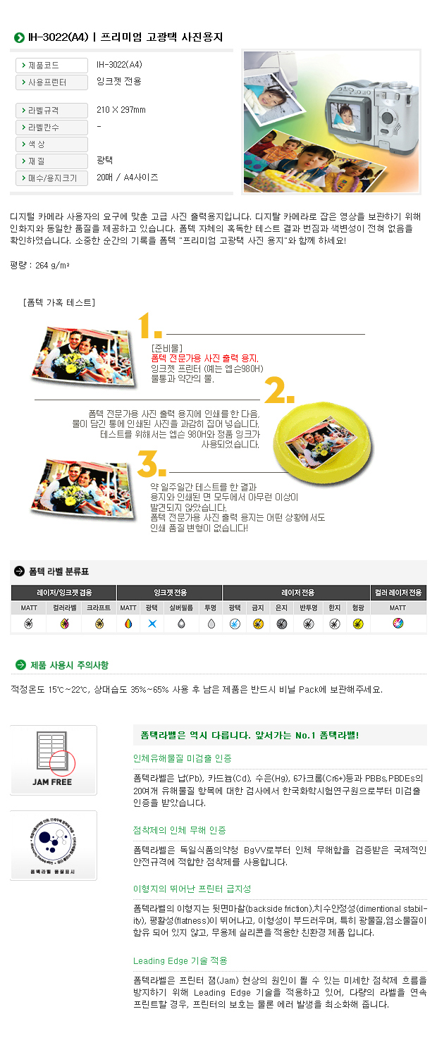 ▶ 품명 : 폼텍 전문가용 고광택 사진용지 IH-3022