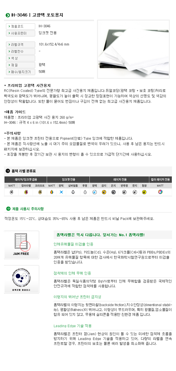 프리미엄 고광택 사진용지 (IH-3046) 4*6 50매