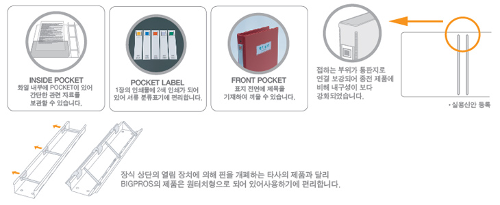 최소면적으로 대용량의 서류를 보관할 수 있는 바인더로 견고하며 기능성이 뛰어납니다.