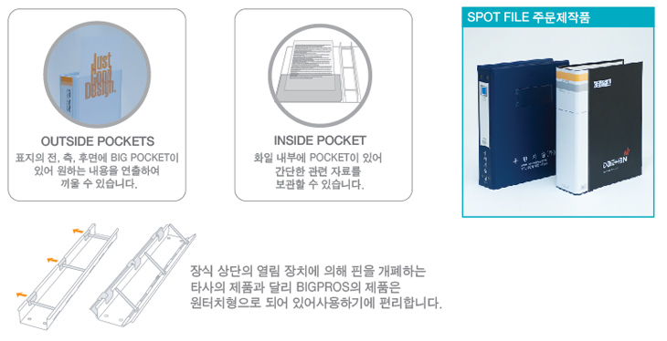 스프링에 의해 부드럽게 열리는 원터치 오픈기능과 표지를 닫으면 자동으로 잠기는 오토 록킹시스템 바인더입니다.