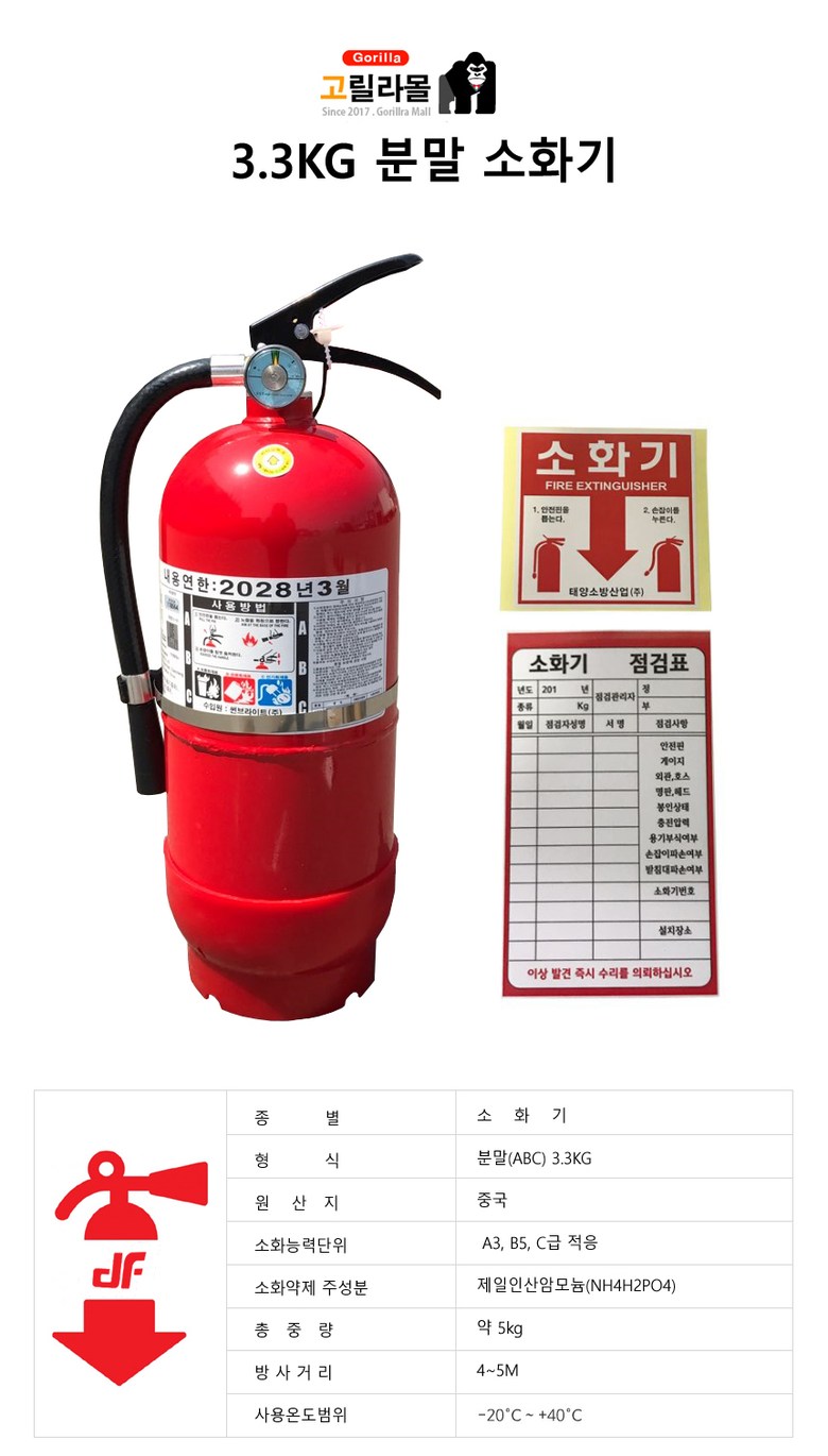 • 규격소화기 분말.총중량:5.1KG.약체중량:3.3KG.방사거리:3~4M.방사시간:11초